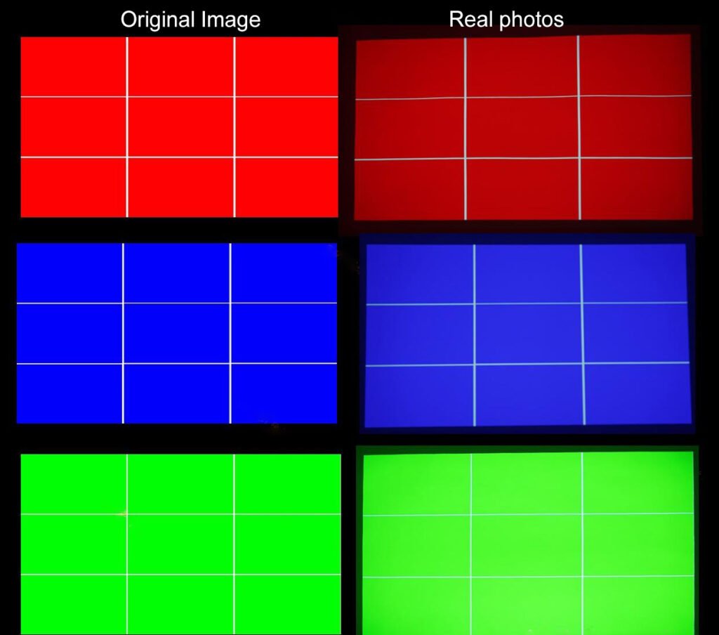 Based on the comparison images, the reproduction of primary colors is accurate, with a uniform brightness distribution. However, the brightness is slightly subdued, though still very good for this price range.