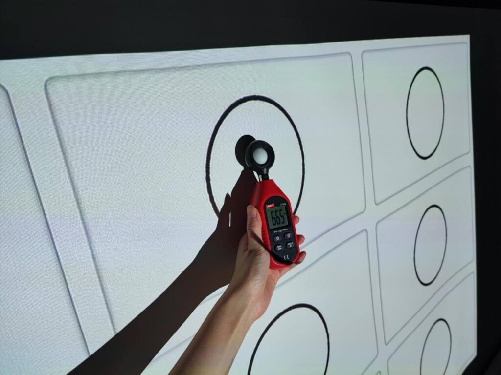 A rigorous nine-point measurement method was applied: brightness was tested at multiple points across the projection area. After collecting the measurements, we calculated the average brightness and the standard deviation across these nine points. We then estimated the luminous flux by multiplying the projected area by the average illuminance.